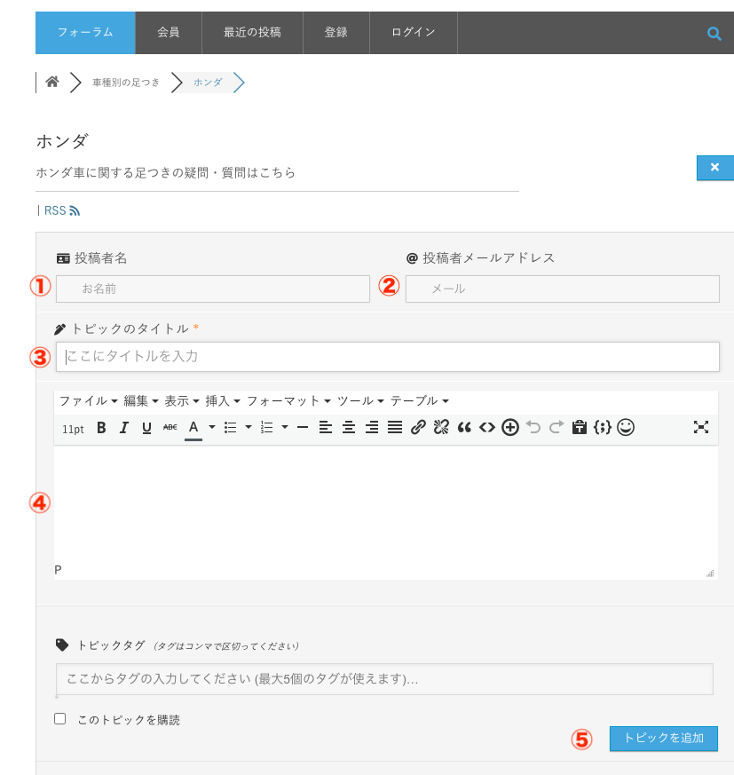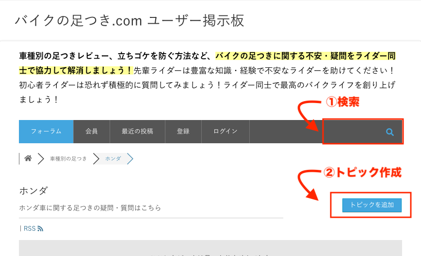 ステップ2すでに同じ質問が出ていない検索(画像中「①検索」から)。無い場合は自分でトピックを作成(画像中「②トピック作成」)